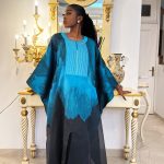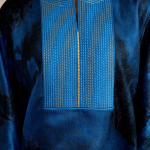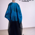 La pièce est sublimée par une grande broderie à l’avant et au dos, réalisée avec précision pour structurer la silhouette et imposer une allure noble. Elle est accompagnée d’une camisole en soie française verte, finement travaillée pour offrir maintien et élégance, ainsi que d’un foulard en mikado gris clair, apportant une touche finale raffinée et parfaitement équilibrée. Ce modèle incarne une élégance forte, harmonieuse et résolument intemporelle.